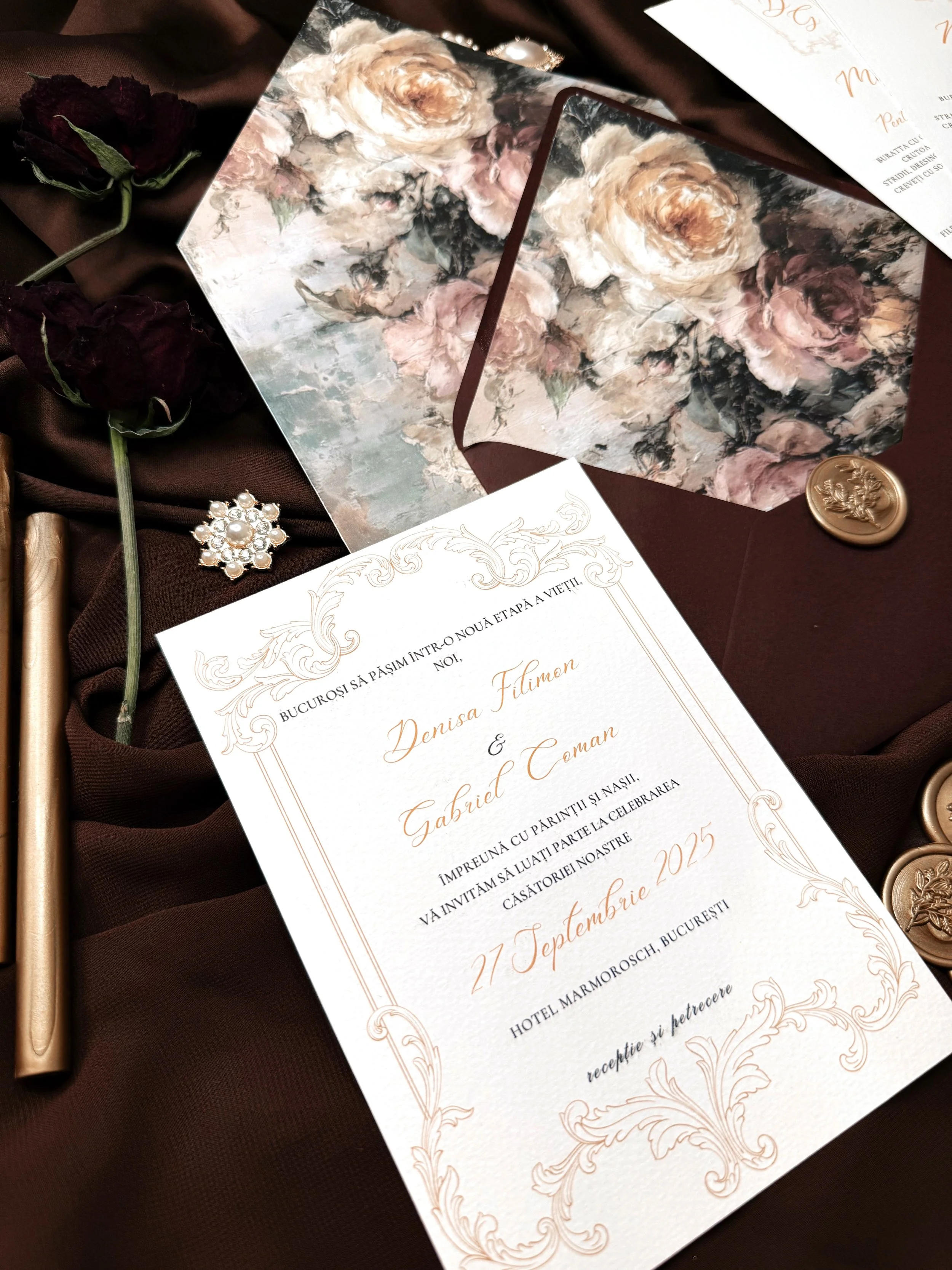 Baroque Reverie este colecția dedicată iubitorilor de detalii elaborate, ramaje ornamentale și compoziții grafice inspirate de arhitectura și arta barocă. Stilul este intens, decorativ și aristocratic, ideal pentru evenimente cu tematică clasică.