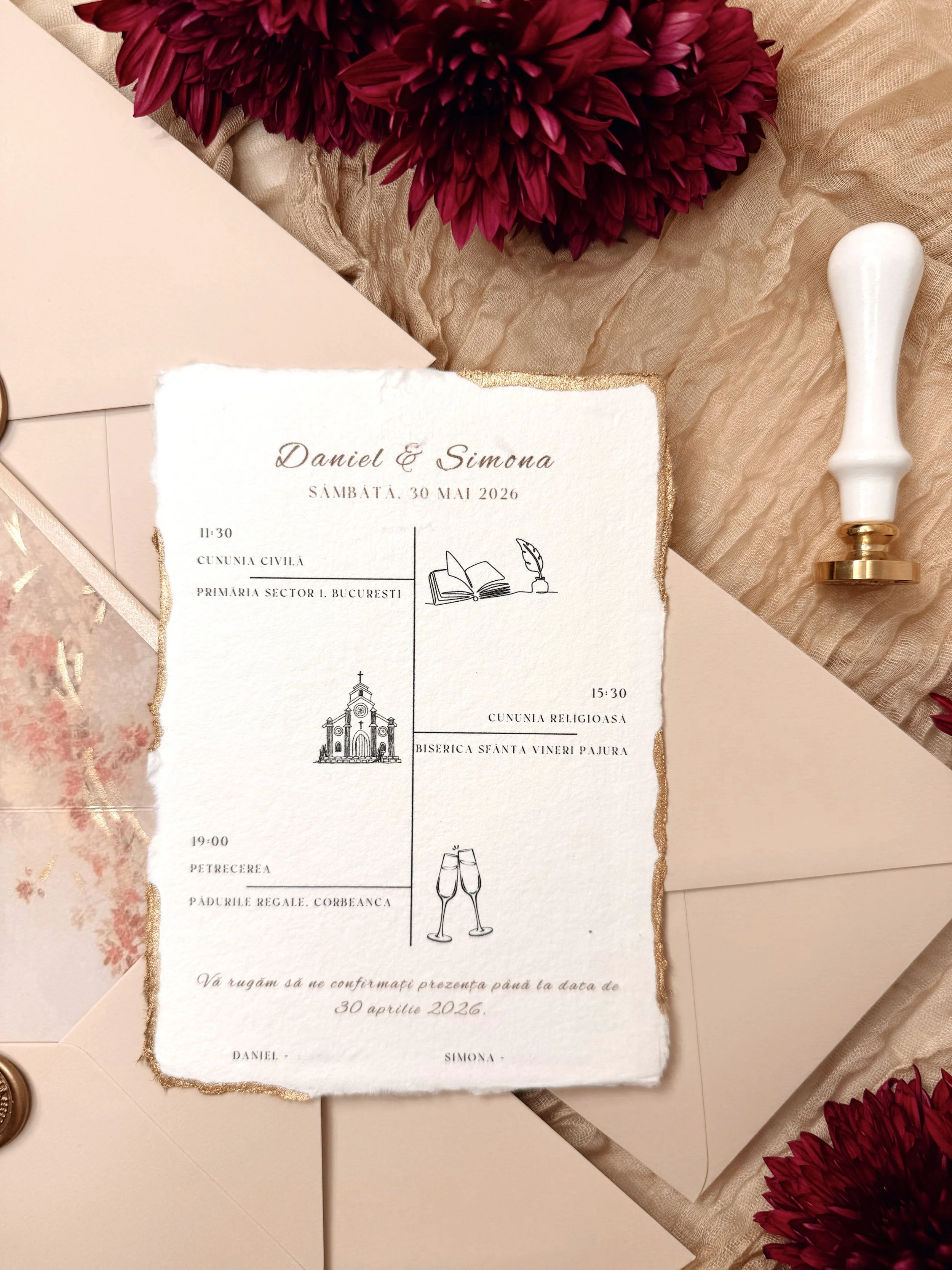 Colecția Aurora îmbină estetica vintage cu luxul discret al detaliilor aurii. Este dedicată celor care își doresc o invitație cu aer regal, iluminată de finisaje metalice și texturi elegante. Fiecare piesă transmite căldură și rafinament, cu note clasice reinterpretate într-o formă modernă.
