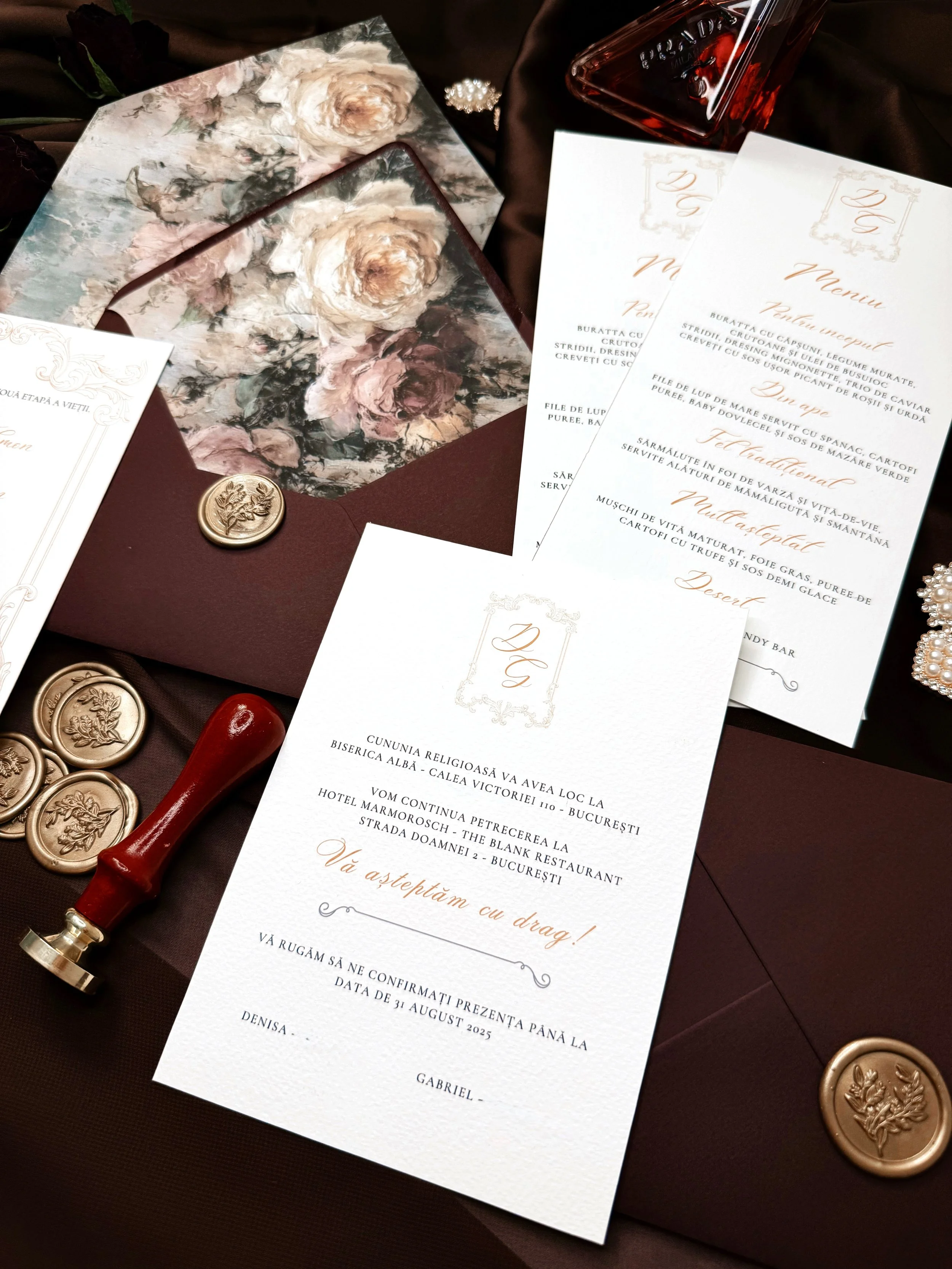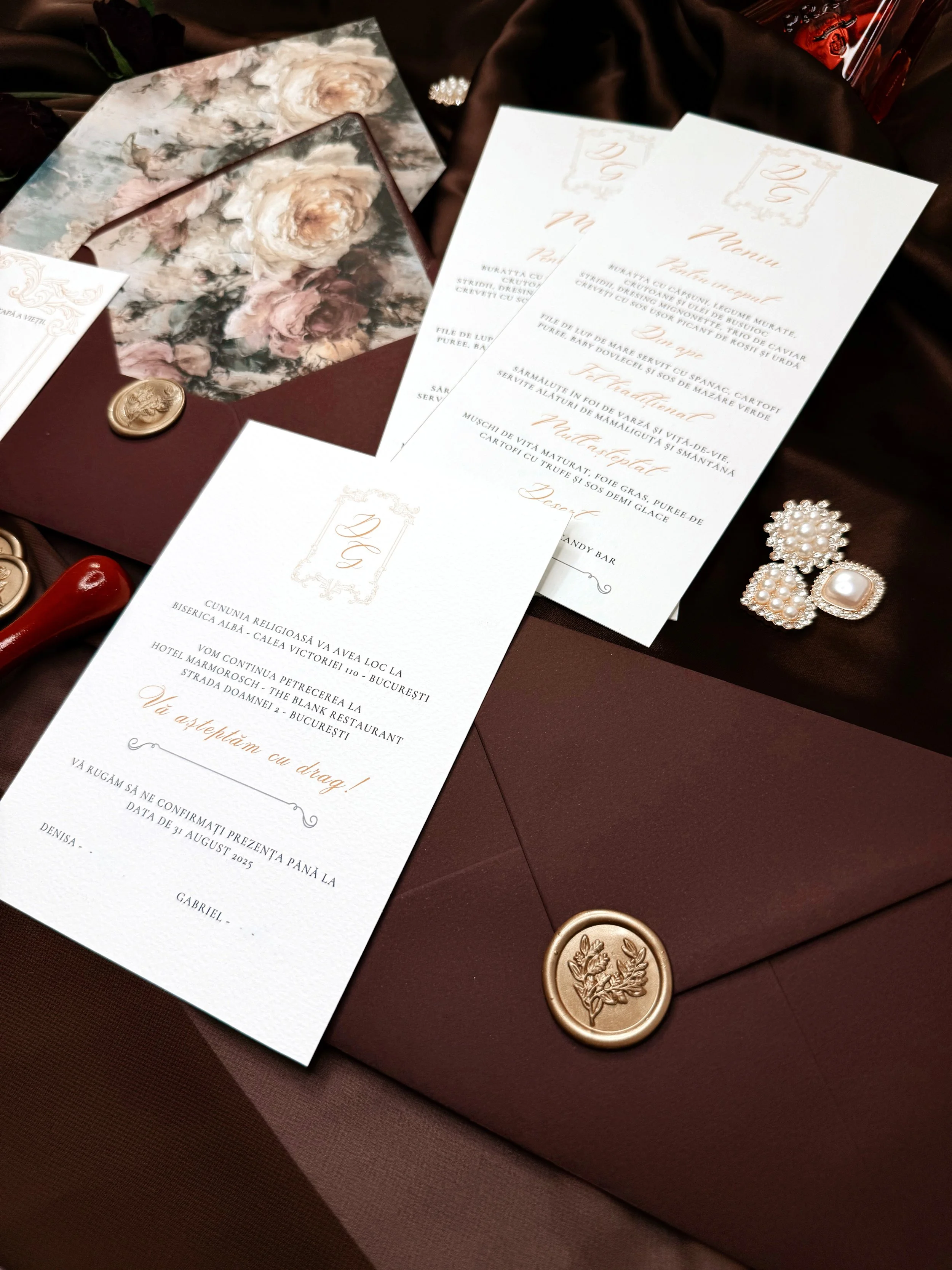 Baroque Reverie este colecția dedicată iubitorilor de detalii elaborate, ramaje ornamentale și compoziții grafice inspirate de arhitectura și arta barocă. Stilul este intens, decorativ și aristocratic, ideal pentru evenimente cu tematică clasică.