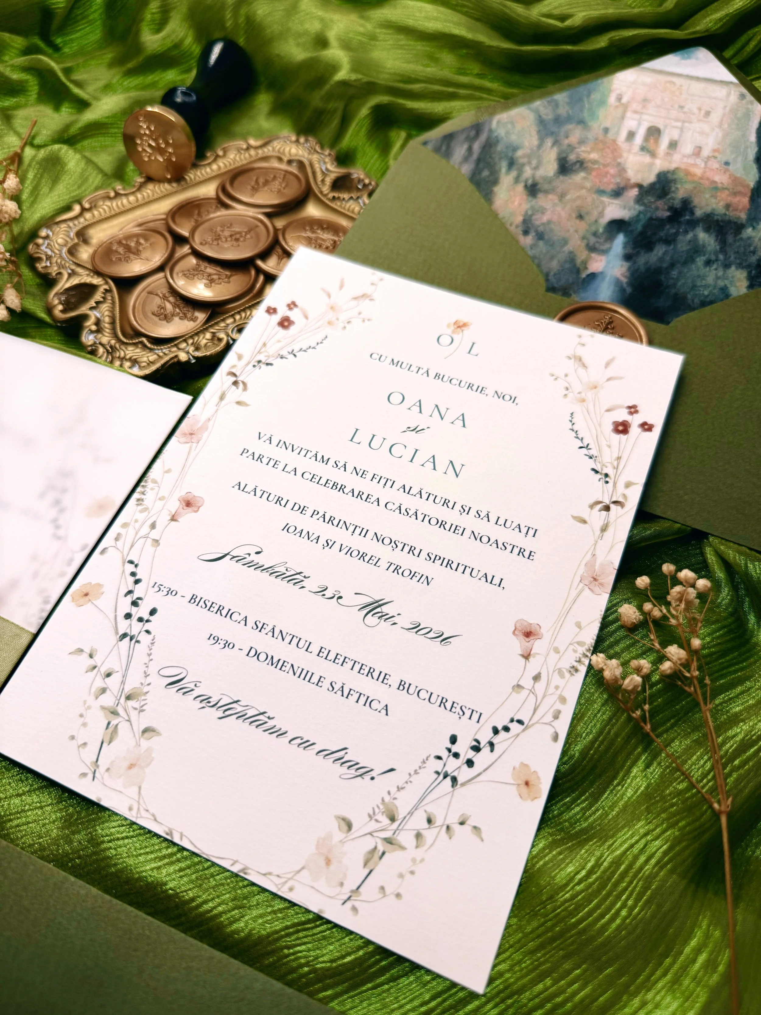 Invitații florale, romantice, picturale — cu aer de grădină secretă